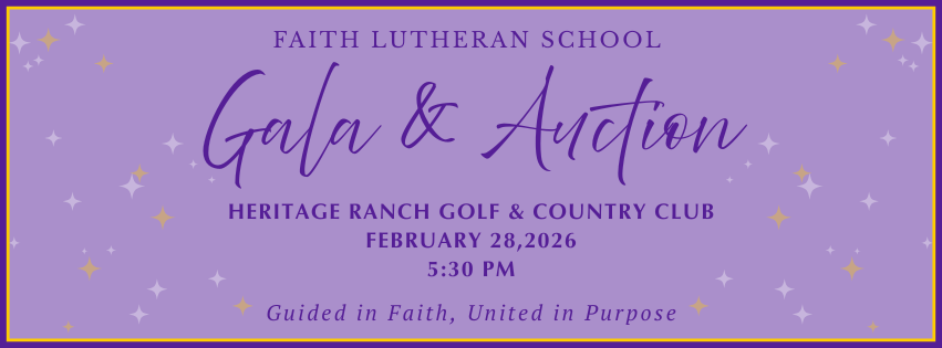 Please join us for the Faith Lutheran School Gala & Auction – “Guided in Faith, United in Purpose” – on Saturday, February 28, 2026, at 5:30 p.m. at Heritage Ranch Country Club in McKinney, Texas. The event will feature a happy hour, silent auction, live auction, a delicious dinner, and entertainment!